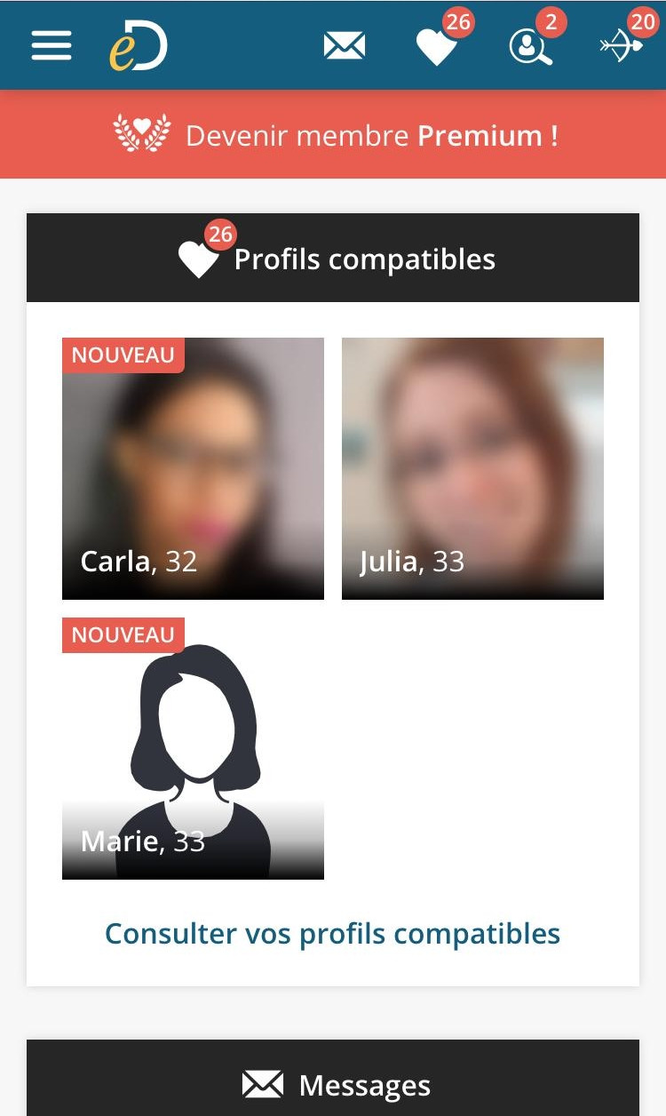 Grâce au test de personnalité, le système de matching proposé par eDarling donne de très bons résultats. Pour les voir, il suffit de se rendre dans la section « Profils compatibles ». Disponible dans le menu du haut. Chaque jour, on y trouve environ 20 à 30 profils dont le taux de compatibilité est élevé par rapport au nôtre. C’est sans hésitation la section la plus importante du site.