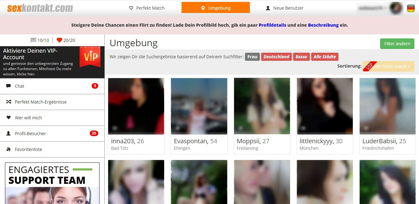 Die Suchfunktion befindet sich auf der Landing-Seite nach dem Einloggen auf Sexkontakt. Sie bietet uns einige nützliche Filter, ist leicht zu benutzen und ziemlich effizient. Wir können wählen, ob wir Profile mit oder ohne Foto angezeigt bekommen haben wollen. Abgesehen davon ist das Sortiersystem eher herkömmlich: Familienstand, Altersgruppe, Geschlecht, Region. Diese Webseite unterscheidet sich in einem Punkt leider nicht von den anderen Seiten: Es ist leider nicht möglich, Suchanfragen nach sexuellen Vorlieben durchzuführen.