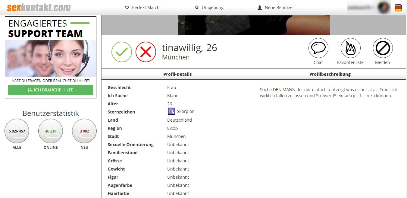 Sexkontakt ermöglicht uns, unserer Dates umgehend nach der sehr schnellen Registrierung zu beginnen. Es genügt, einige Pflichtfelder auszufüllen: Alter, Pseudo, was wird gesucht (Mann, Frau, beides) und Region. Am Ende muss eine E-Mail-Adresse eingegeben werden, um sich in die Seite einloggen und mit der Erkundung beginnen zu können. Um die Erfolgschancen unseres Profils zu steigern und den richtigen Partner zu finden, haben wir ein paar weitere Minuten in die Vervollständigung unseres Profils investiert. Wir haben die folgenden Informationen zusätzlich eingegeben :