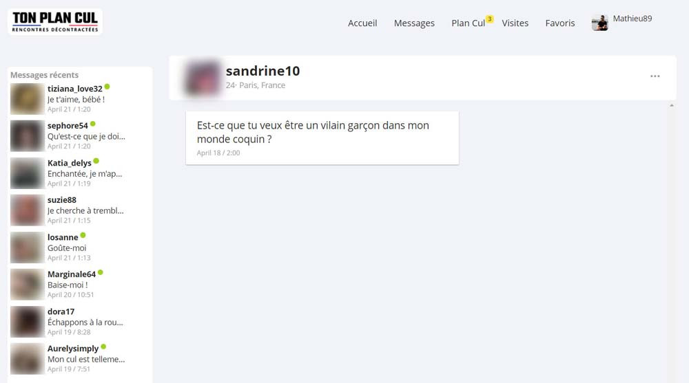 Nous sommes tous les deux habitués à tester des sites de rencontre coquine, et on pourrait dire qu’on a presque tout vu. Néanmoins, il faut bien avouer que les membres de TonPlanCul ont réussi à nous surprendre ! Nous avons rarement reçu autant de messages spontanés et si peu équivoques. Des « je vais t’envoyer des selfies à poil » alors qu’on avait rien demandé, voilà quelque chose de rare ! Quoi qu’il en soit, on ne s’en plaint pas du tout. D’un autre côté, il semblerait qu’il y ait beaucoup de comptes inactifs. Pas mal de nos messages sont en effet restés sans réponse. Et en y regardant de plus près, tout s’explique puisque plusieurs de ces femmes ne c’étaient pas connectées au cours du dernier mois …